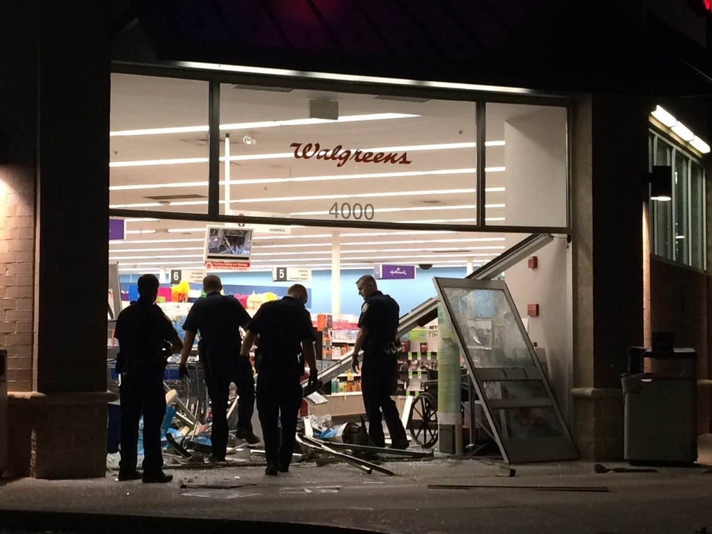 Police say a white van without license plates backed into the store front of the Walgreens twice, shattering the store front glass and loosening an ATM.