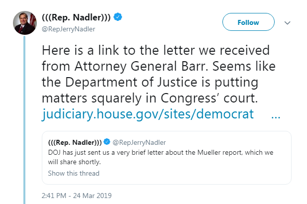 Democratic Rep. Jerry Nadler tweeted a link to the letter received from Attorney General Barr. You can read that here.