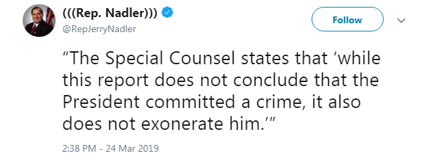Nadler also tweeted that the report has not exonerated the President.