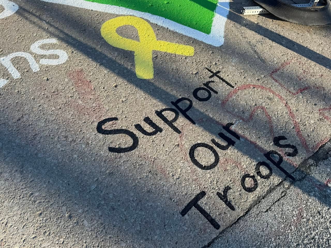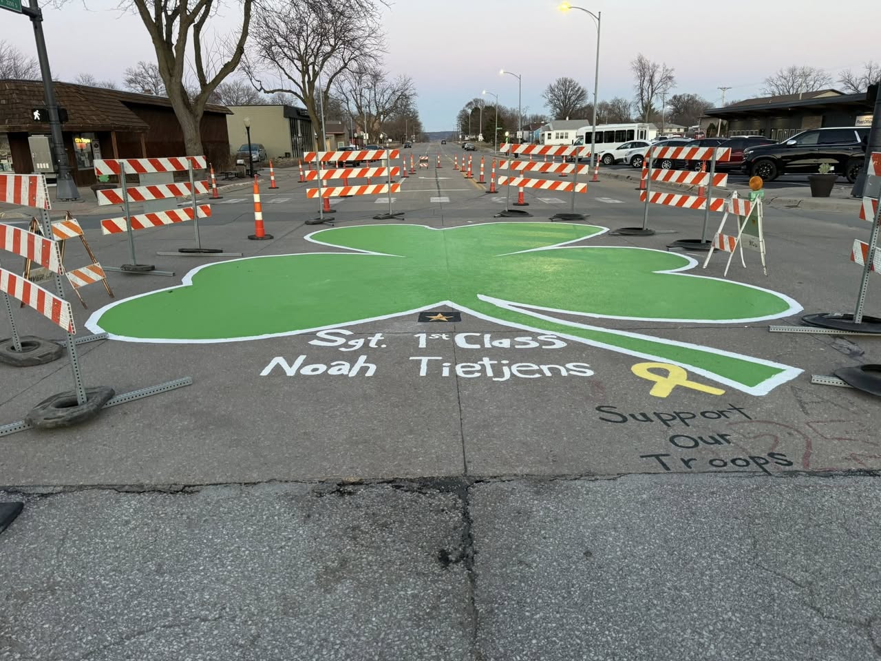 The city added the name of Sgt. 1st Class Noah Tietjens to it’s annual painting of the giant shamrock at the intersection of Mission Avenue and Franklin Street.