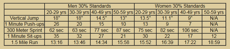 The test is made of five components: a vertical jump, pushups, sit–ups, a 300 meter and 1.5 mile run.