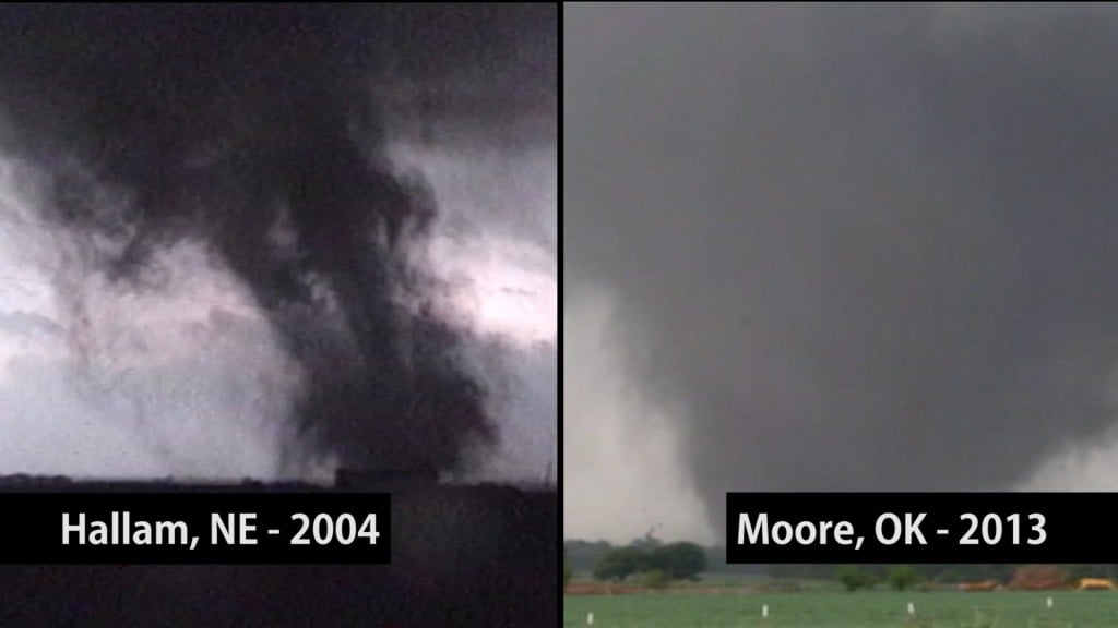 Both tornados approached the two-mile wide figure, both tornados were in the EF-4 to EF-5 classification range. The difference, Moore, Okla., has seen three of these in the last four years and has a population of about 56,000. Hallam only has a couple hundred people.