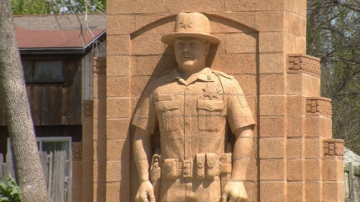 The entrance of the park is marked by a sculpted brick statue of Deputy Dodge, with a memorial plaque on the back.