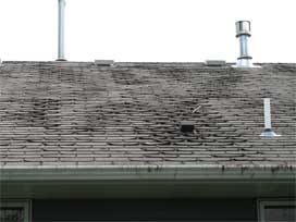 A faulty shingle made from organic materials and ashpalt that curls and can fall off during heavy rain.