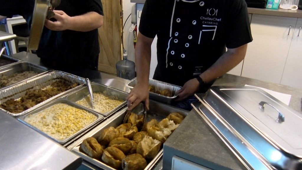 The catering company is offered some of their wham bam meals in a pan. Which is a stuffed baked potato.