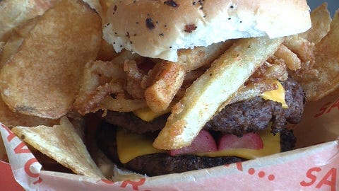 “The Haymaker…the Haymaker. It's two third-pound burgers with a hot dog on top of it, then with grilled onions and french fries on top, and a little bit of coleslaw, pressed together. It's a fabulous sandwich.”
