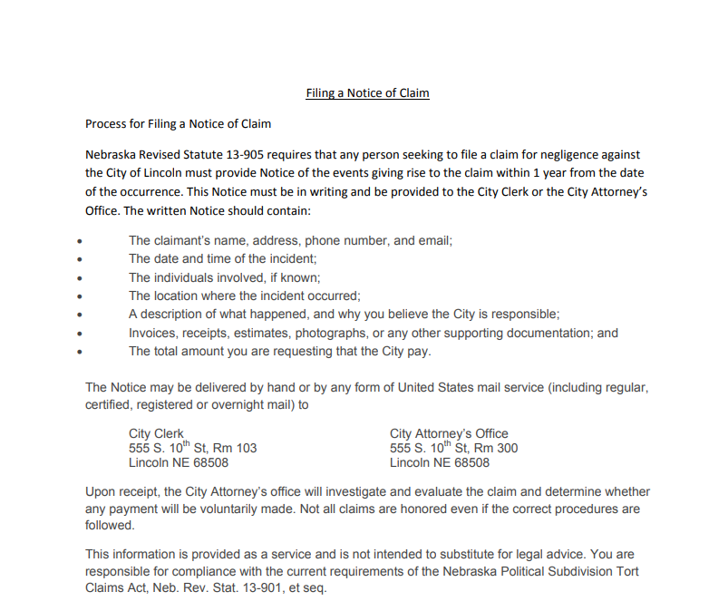 When a claim is filed, the City of Lincoln asks for basic information about the incident. Then, the law department reviews the claim to determine whether the damage was caused by City negligence.