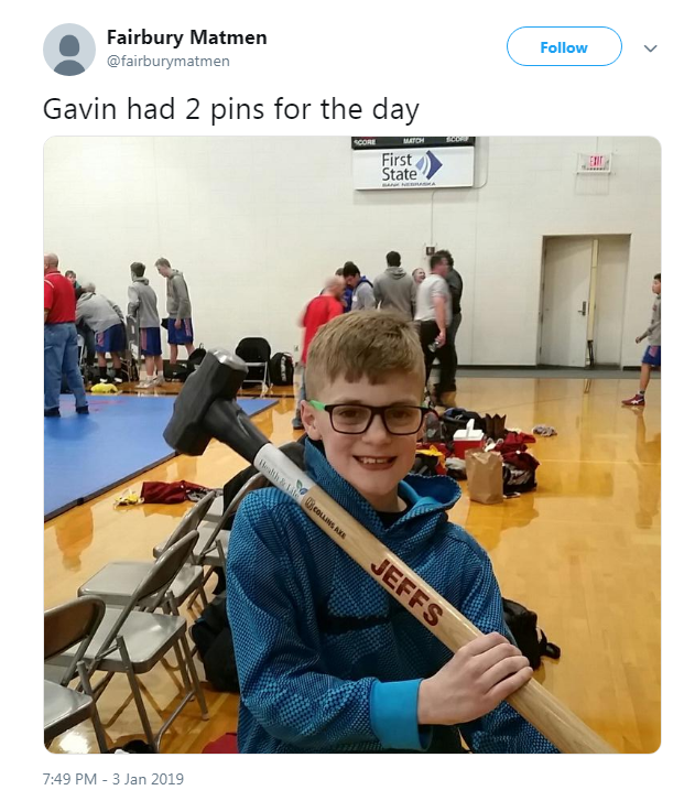 Twitter user Fairbury Matmen tweeted this picture at the Fairbury Dual.  This is Gavin, and he got two pins at the meet.  Way to go, Gavin! Way to bring down the hammer.