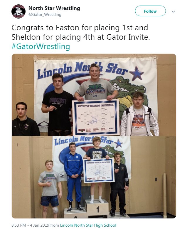 Also in the wrestling world. Lincoln North Star Wrestling shared this photo from their Gator Invite.  Two of their own wrestler placed in the meet.  Easton placed first, and Sheldon placed fourth.  Congratulations!