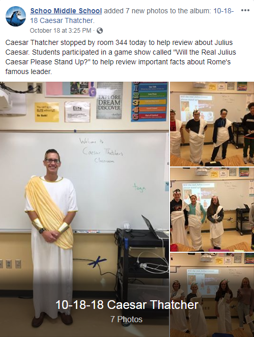 Caesar Thatcher stopped by Room 344 at Schoo Middle School to help review about Julius Caesar. Students participated in a game show called, “Will the real Julius Caesar please stand up?” to review important facts about Rome’s famous leader.