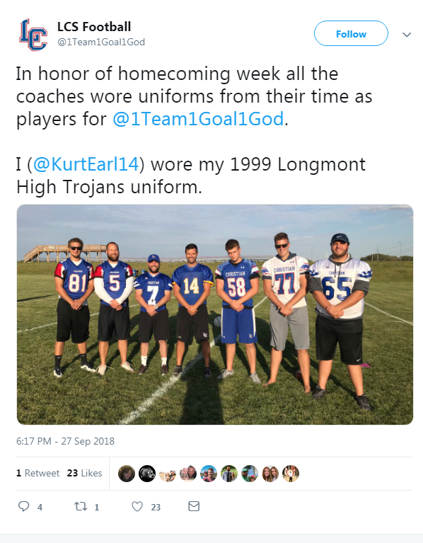 Lincoln Christian Football posted this, in honor of homecoming week all the coaches wore uniforms from their time as players!