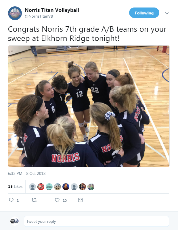 It says congrats to Norris 7th and 8th grade a and b teams on your sweep at Elkhorn Ridge tonight!